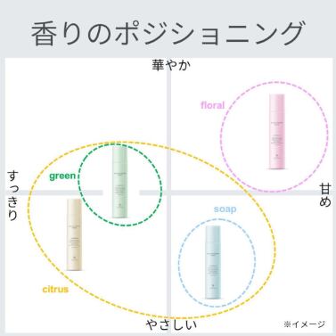 トップにフレッシュなシトラス、ラストにやさしいムスクをあわせたリラックスグリーンティの香り。